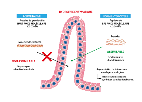 Naturellement le collagène est une très grosse protéine (300 000 Daltons) qui est difficilement assimilable au niveau de la paroi intestinale.
